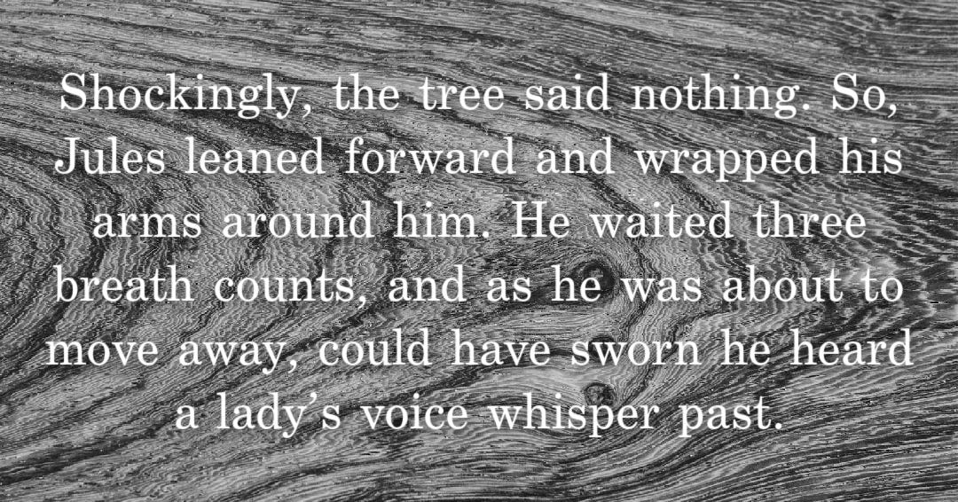 Jules was resigned to this one all on his own. He looked up at the tree from where he stood at its roots, and felt perhaps an inkling of understanding as to why this tree got the reputation it had. Or he had. It was eerie, being this close to such a large and historical tree, which seemed now far too leering and oversized than it had when Jules stood on the other side of the fence. The boy scurried forward and in a voice he hoped sounded less fearful than his thoughts made it, said, “I didn’t mean to offend you, Mr. Hanging Tree. It’s not every day a kid learns about these things and I’m sorry that I said some mean stuff. Can we —“ he grimaced “— hug it out?”