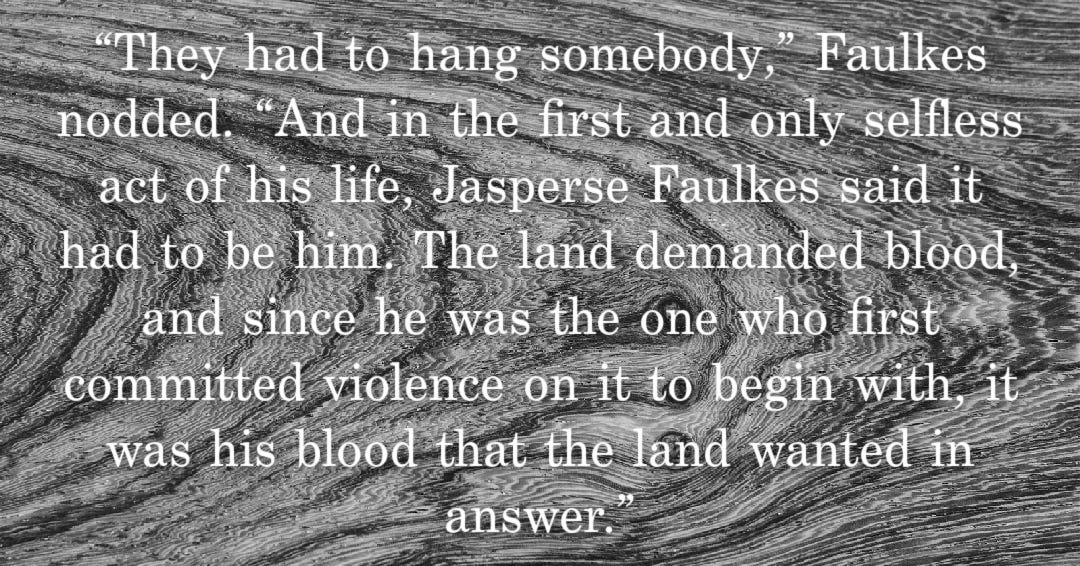 “When a later descendent of Jasperse Faulkes, a boy by the name of Luther, got the hankerin’ to go be a lawyer ‘stead of a row crop farmer like the rest of his family — round about three greats or so ago, I reckon — he decided to sell his acreage of the farm, where the hangin’ tree was,” Faulkes went on. “From the way my grandaddy told it, y’all should’ve damn seen the way folks went crazy! Like all hell broke loose in this town. All people cared about was the stinkin’ tree. The old ones cared, anyways. Most of the younger folks thought it was superstition, but they ain’t seen the hangins.”